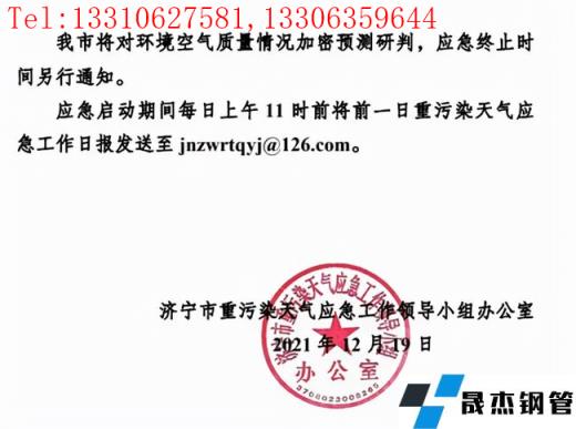 根據濟寧市環境空氣質量研判專家團隊會商結果,預計2021年12月20日起濟寧市將出現持續性中至重度污染,經市重污染天氣應急工作領導小組辦公室研究決定,濟寧市自2021年12月19日15時發布重污染天氣橙色預警,12月20日8時啟動II級應急響應。