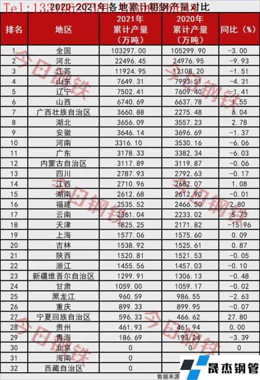 從分省數(shù)據(jù)來(lái)看,對(duì)比2020年各省數(shù)據(jù),2021年4省市粗鋼產(chǎn)量同比降幅超5%。其中河北降9.93%、河南降6.06%,廣東和天津分別降6.03%、15.96%。詳見(jiàn)下表: