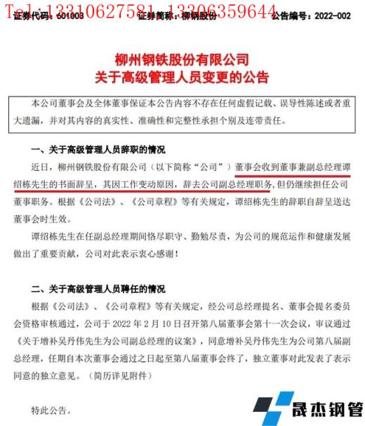 2月10日,柳州鋼鐵股份有限公司發(fā)布關于高級管理人員變更的公告。公告顯示,柳鋼股份董事會收到董事兼副總經理譚紹棟的書面辭呈,其因工作變動原因,辭去柳鋼股份副總經理職務,但仍繼續(xù)擔任柳鋼股份董事職務。