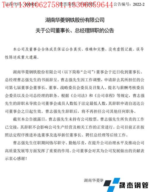 日前,湖南華菱鋼鐵股份有限公司發(fā)布公告稱,公司董事會于近日收到董事長、總經理曹志強的書面辭呈。曹志強因工作調整,申請辭去其所擔任的公司第七屆董事會董事長、董事、戰(zhàn)略委員會委員及召集人、提名與薪酬考核委員會委員以及公司總經理的職務。