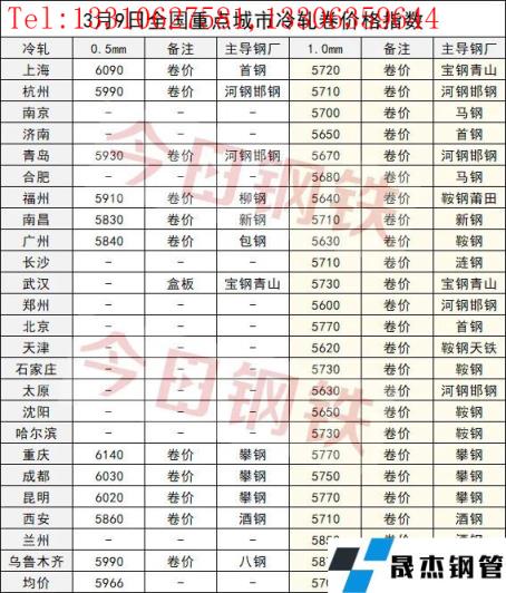 截至3月9日,全國主要城市0.5mm冷軋板卷均價5966元/噸,周環比上漲59元/噸;1.0mm冷軋板卷均價5708元/噸,周環比上漲65元/噸。以下為3月4日與3月9日全國重點城市冷軋板卷價格指數對比情況: