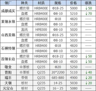 下調(diào)5家,占比50%,調(diào)價(jià)幅度20-70元/噸;