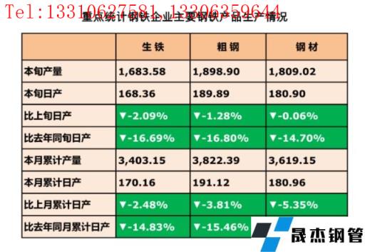 2月24日訊,2月中旬,重點統(tǒng)計鋼鐵企業(yè)共生產(chǎn)粗鋼1898.9萬噸、生鐵1683.58萬噸、厚壁鋼管1809.02萬噸。其中,粗鋼日產(chǎn)189.89萬噸,環(huán)比下降1.28%;生鐵日產(chǎn)168.36萬噸,環(huán)比下降2.09%;厚壁鋼管日產(chǎn)180.9萬噸,環(huán)比下降0.06%。厚壁鋼管庫存量1690.35萬噸,比上一旬增加4.95萬噸,增長0.29%;比去年同期減少64.38萬噸,下降3.67%。