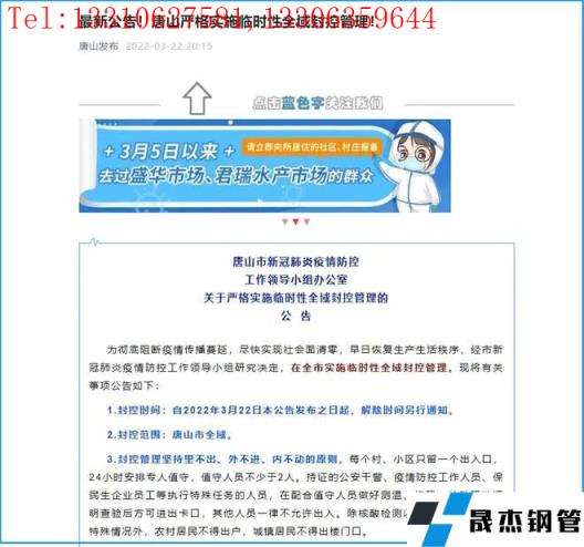 免責聲明:本網站(山東聊城晟杰無縫鋼管廠www.vsocial.cn)刊載的“突發!唐山全域性封控,鋼市影響升級”等均源于網絡,版權歸原作者所有,且僅代表原作者觀點,本文所載信息僅供參考。轉載僅為學習與交流之目的,如無意中侵犯您的合法權益,請及時聯系刪除。本網站刊登此篇文章并不意味著本站贊同其觀點或證實其內容的真實性,我們不對其科學性、嚴肅性等作任何形式的保證。如果侵犯了您的版權,請盡快聯系我們予以撤銷,謝謝合作!