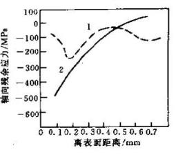 滲碳劑活性太大,滲碳時間過長和滲碳后冷卻速度太慢時,滲層中易形成網狀或大塊狀碳化物,這些碳化物主要是滲碳體和合金滲碳體。碳化物的形成導致其周圍局部合金元素貧化和淬透性下降,淬火后易形成非馬氏體組織。網狀和大塊狀碳化物及非馬氏體組織的形成降低了滲層中有利的殘余壓應力,見圖3 ,可使滲碳工件的疲勞強度降低25%~30%。