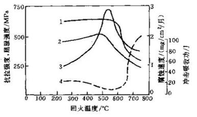 2.2.6脫碳的影響 滲碳工件在緩冷期和重新加熱淬火期間,由于溫度連續變化,氣氛碳勢和滲碳工件表面碳的質量分數不可能達到平衡。當氣氛碳勢低于滲碳表面的碳的質量分數時,滲碳工件表面發生脫碳。脫碳層的顯微組織取決于表層的碳的質量分數及淬火冷卻速度,當表層僅有輕微脫碳時,有可能降低表層殘余奧氏體含量,表層硬度下降很少甚至略有提高;嚴重的脫碳將使表層出現非馬氏體組織,降低表層硬度,使表層呈現殘余拉應力狀態,使疲勞強度下降。試驗表明,0.22mm的脫碳層使Cr-3%Ni鋼的彎曲疲勞強度降低40%。當CrMnTi鋼的滲碳層由于脫碳使其硬度下降到41~42HRC時,疲勞極限下降50%。三、耐腐蝕性能不良 在腐蝕性環境中工作的零件大多用不銹鋼制造。不銹鋼是含鉻超過5%的鐵基合金的總稱。但要從真正耐腐蝕的角度看,鋼中鉻的含量(w)必須超過10%。不銹鋼的耐腐蝕性來自于其中的鉻,這歸因于不銹鋼的表面能形成一層稱為鈍化膜的耐腐蝕的富鉻薄膜,由水化鉻酸CrxOx(OH)8x-2·nH2O組成。鉻的質量分數越高。鈍化膜中相對鉻含量越多。耐腐蝕性越好。不銹鋼按其金相組織分為馬氏體不銹鋼、鐵素體不銹鋼、奧氏體不銹鋼、鐵素體-奧氏體不銹鋼和沉淀硬化不銹鋼五類,鉻在不銹鋼中分布不均勻將導致其耐腐蝕性下降,熱處理影響鉻在不銹鋼中的分布,因而熱處理也極大的影響不銹鋼的耐蝕性。2Cr13型馬氏體不銹鋼若回火溫度選擇不當,在450℃~600℃回火時,由于Cr23C6型碳化物沿晶界析出,導致晶界附近局部鉻貧化,腐蝕抗力大幅度下降,如圖5 所示。▲圖5回火溫度對2Cr13性不銹鋼性能的影響1-抗拉強度2-屈服強度 3-20℃NaCl 3%水溶液中的腐蝕率4-艾氏沖擊韌度