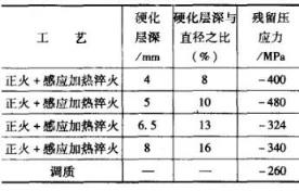 ▲圖4半軸表面淬火的硬化層深度花鍵部:齒根硬化層深度(按測量到半馬氏體區計算)應達到花鍵部軸頸的10%(δ1=10%D)。桿部:硬化層深度應達到桿部直徑的15%(δ2=15%D0)。法蘭根部:要求法蘭盤與桿部連接的過渡圓角淬硬。在實際生產中,圓角處硬化區域的最小直徑應比半軸桿部直徑大25%。這些要求是為了保證半軸的靜強度和疲勞強度。花鍵與桿部的淬硬層深度對靜強度影響較大,法蘭圓角淬硬對疲勞極限影響較大。每種表面淬火半軸都有最佳的硬化層深,應考慮到硬化層深對表層殘留壓應力的影響。表6 列出了直徑為50mm的帶法蘭半軸感應加熱淬火后花鍵尾根部位的殘留壓應力。▼表640MnB半軸感應淬火后表面殘留壓應力