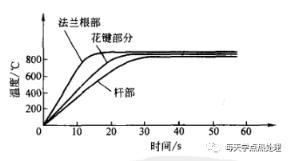 ▲圖7采用矩形感應器整體一次感應加熱淬火時,半軸表面的均溫加熱曲線由于在有效圈A端圓弧(見圖6) 上鑲有硅鋼片導磁體,所以法蘭根部圓角部位升溫較快,加熱均溫時間長,保證了該處的硬化層深和足夠的硬化區域。采用整體一次感應加熱淬火還能提高花鍵齒頂的硬度。采用矩形感應器加熱時,由于感應器和零件之間間隙較大(一般為5~8mm),所以升溫慢,加熱時間長,硬化層厚且均勻。半軸回火也可采用矩形感應器加熱,采用15~20℃/s的升溫速度,控制感應加熱回火溫度在(250±10)℃范圍內,可以使半軸表面硬度控制在52~63HRC的范圍內,性能良好。