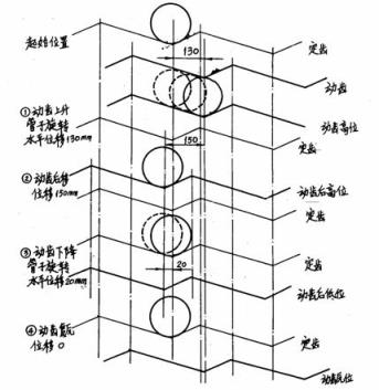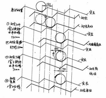 厚壁鋼管在同一個齒形內(nèi)動作,如圖8-4。在一個周期內(nèi)管子前移距離為四個步驟位移之和,等于130+(一150)十20+0=0。