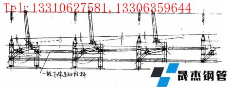 厚壁鋼管離開水槽將自行濃動到第一級下降機構(gòu)的固定梁上,然后被第一級下降機構(gòu)的活動梁接收,第一級下降機構(gòu)在液壓缸操作下使連桿帶動全部活動梁運動,將厚壁鋼管送到第二級下降機構(gòu)的固定梁上,然后通過同樣的動作方式將厚壁鋼管送至管排收集臺架上。厚壁鋼管被第一級下降機構(gòu)送到第二級下降機構(gòu)的固定梁的過程中,由于厚壁鋼管在長度方向上下降的高度不同,因而使厚壁鋼管傾斜,使管中殘留的水排出。但通過第二級下降機構(gòu)送至收集臺架時,由結(jié)構(gòu)決定使厚壁鋼管下降高度在長度方向恢復(fù)了平衡。這樣厚壁鋼管就可以很穩(wěn)定地進入精整鋸切區(qū)域。
