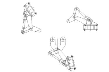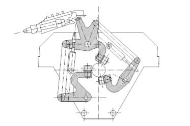 5.2.3.3 平衡裝置由于PQF三輥軋機軋輥的特殊裝配方式,平衡裝置也配套采用新型設計,其裝置為液壓缸帶動一撥叉,撥叉壓在“C”形臂的“肩”上,壓下裝置的力是向軋制中心線的力,平衡力是反力。由于PQF的布置方式,三個平衡叉中,上兩個為單向撥叉,下面的一個為雙向撥叉。它們的行程為:上兩個:100mm;下撥叉:81mm。平衡叉結構見圖5-22。