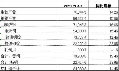 根據(jù)日本鋼鐵協(xié)會(huì)的統(tǒng)計(jì),2021年日本生鐵產(chǎn)量為7034萬(wàn)噸,同比增長(zhǎng)14.2%。粗鋼產(chǎn)出當(dāng)中,轉(zhuǎn)爐鋼產(chǎn)量為7194.5萬(wàn)噸,同比提高16%,電爐鋼產(chǎn)量達(dá)2438.8萬(wàn)噸,同比增長(zhǎng)15.4%。