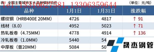 1月國內(nèi)厚壁無縫鋼管市場整體呈現(xiàn)了震蕩偏強(qiáng)走勢,而板材價(jià)格分化明顯,螺紋鋼修復(fù)性反彈近百元,熱軋板卷上漲了136元,但中厚板表現(xiàn)趨弱。原料方面價(jià)格漲幅強(qiáng)于預(yù)期,1月在無縫厚壁鋼管廠家復(fù)產(chǎn)和節(jié)前補(bǔ)庫需求支撐下,鐵礦石價(jià)格持續(xù)上漲,62%澳洲粉礦港口現(xiàn)貨價(jià)格指數(shù)960.0元/濕噸,環(huán)比月初上漲158.0元/濕噸,漲幅19.7%。整體來看,宏觀消息面利好,厚壁無縫鋼管供應(yīng)快速下滑,導(dǎo)致庫存累積幅度不及預(yù)期,而需求結(jié)束較晚,使得鋼價(jià)走強(qiáng)。