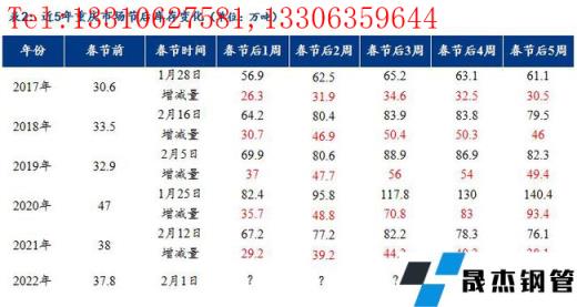 免責聲明:本網站(山東聊城晟杰無縫鋼管廠www.vsocial.cn)刊載的“近5年春節前后重慶螺紋鋼價格和庫存走勢”等均源于網絡,版權歸原作者所有,且僅代表原作者觀點,本文所載信息僅供參考。轉載僅為學習與交流之目的,如無意中侵犯您的合法權益,請及時聯系刪除。本網站刊登此篇文章并不意味著本站贊同其觀點或證實其內容的真實性,我們不對其科學性、嚴肅性等作任何形式的保證。如果侵犯了您的版權,請盡快聯系我們予以撤銷,謝謝合作!