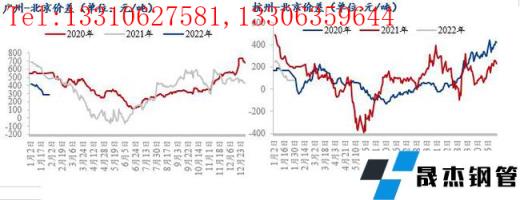 1月份廣州、杭州市場(chǎng)市場(chǎng)價(jià)格漲幅緩慢,北京市場(chǎng)價(jià)格漲幅居前,因此廣州-北京、杭州-北京市場(chǎng)的區(qū)域價(jià)差均有所收窄。目前廣州-北京價(jià)差在300元/噸左右,此價(jià)差略低于2020年、2021年同期水平,且結(jié)合無(wú)縫厚壁鋼管廠家的政策以及運(yùn)費(fèi)來(lái)看此價(jià)差也不足以吸引北方區(qū)域資源南下廣州。目前杭州-北京價(jià)差不足100元/噸,因北京價(jià)格相對(duì)高位,加之東北區(qū)域節(jié)后需求啟動(dòng)較晚,因此東北區(qū)域部分無(wú)縫厚壁鋼管廠家傾向于把資源投放至北京區(qū)域,其中西林、新?lián)徜撋踔劣诤v味加写税才拧?/p>