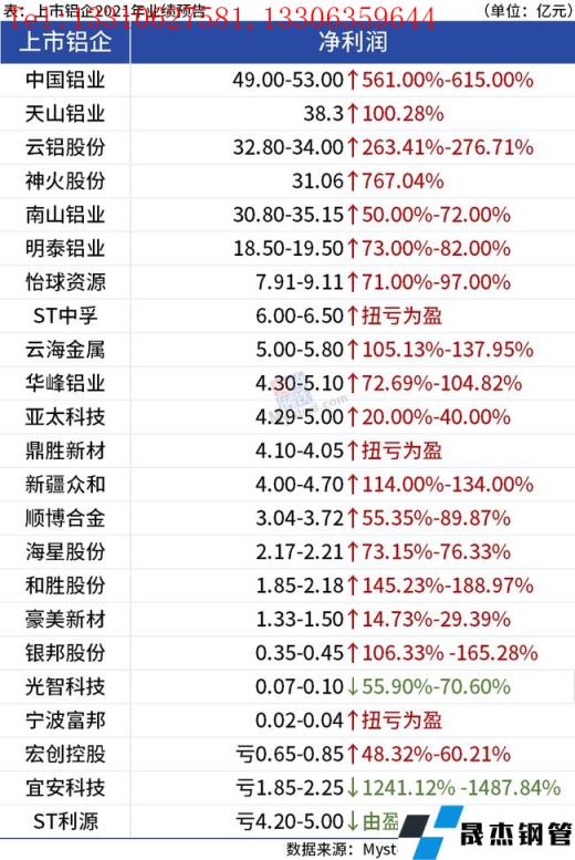 免責聲明:本網站(山東聊城晟杰無縫鋼管廠www.vsocial.cn)刊載的“23家上市鋁企披露2021年業績預報,超8成凈利潤增長”等均源于網絡,版權歸原作者所有,且僅代表原作者觀點,本文所載信息僅供參考。轉載僅為學習與交流之目的,如無意中侵犯您的合法權益,請及時聯系刪除。本網站刊登此篇文章并不意味著本站贊同其觀點或證實其內容的真實性,我們不對其科學性、嚴肅性等作任何形式的保證。如果侵犯了您的版權,請盡快聯系我們予以撤銷,謝謝合作!