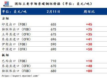 本周獨聯體價格持續上漲。目前方坯出口價格約為670-680美元/噸FOB,較節前上漲約30美元/噸。