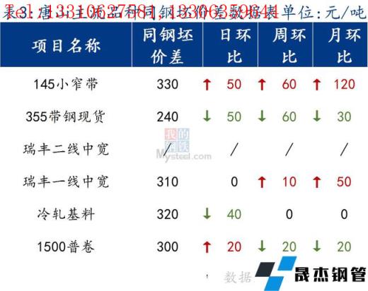 145帶鋼與鋼坯價差拉大,小窄帶漲幅高于鋼坯上漲速度,調(diào)坯軋材廠仍在停產(chǎn)。焊管與355帶鋼價差較昨日持平,熱卷與帶鋼價差擴(kuò)大,卷帶差修復(fù)。