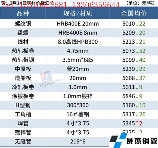 建筑厚壁無縫鋼管:2月14日,全國31個主要城市20mm三級抗震螺紋鋼均價5010元/噸,較上個交易日下跌22元/噸。終端陸續開工,采購量較少,投機性需求寥寥無幾,全天成交表現較差。短期來看,受原料端拖累,期螺走弱,帶動市場避險情緒升溫,市場套現需求增加,不過整體需求偏弱。預計15日國內建筑厚壁無縫鋼管價格或將繼續趨弱為主。