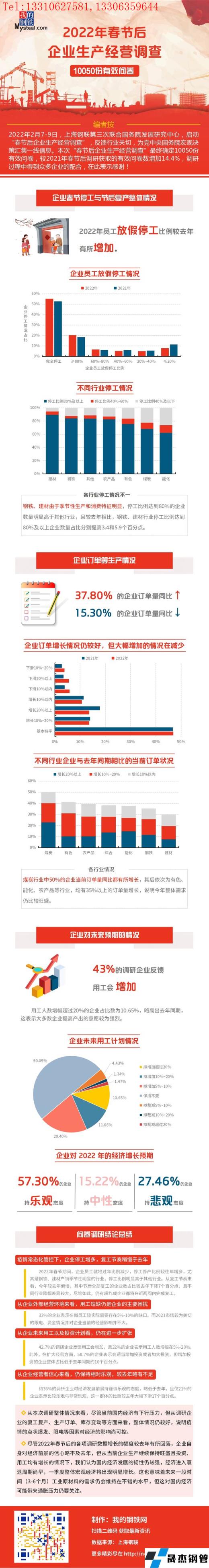 2022年2月7-9日,上海鋼聯第三次聯合國務院發展研究中心,啟動“春節后企業生產經營調查”,反饋行業關切,為黨中央國務院宏觀決策匯集一線信息。本次“春節后企業生產經營調查”最終確定10050份有效問卷,較2021年春節后調研獲取的有效問卷數增加14.4%。 具體結論如下: