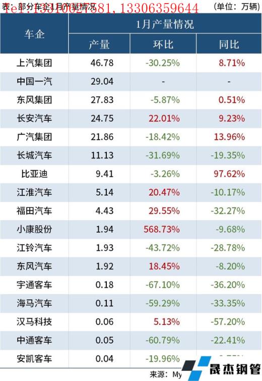 由于今年春節早,1月最后一周進入車市的春節休眠期,因此從同比來看1月車企的產銷量不如去年。除上汽集團、東風汽車、長安汽車和比亞迪幾家大車企外,其余車企的產銷量皆有不同幅度的下降。