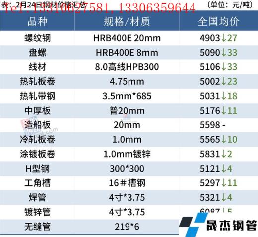 建筑厚壁無縫鋼管:2月24日,全國31個主要城市20mm三級抗震螺紋鋼均價4903元/噸,較上個交易日跌9元/噸。短期來看,一方面當前國際形勢緊張,導致市場情緒偏空;另一方面,近期鐵礦等原料價格下挫,拖累成材價格,加上近期需求恢復不及預期,短期仍然處于供需雙弱格局。因此預計25日國內(nèi)建筑厚壁無縫鋼管或?qū)⒕S持弱勢運行。