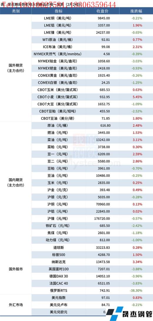 免責聲明:本網站(山東聊城晟杰無縫鋼管廠www.vsocial.cn)刊載的“受近期局勢影響大宗商品價格一覽表(2月24日)”等均源于網絡,版權歸原作者所有,且僅代表原作者觀點,本文所載信息僅供參考。轉載僅為學習與交流之目的,如無意中侵犯您的合法權益,請及時聯系刪除。本網站刊登此篇文章并不意味著本站贊同其觀點或證實其內容的真實性,我們不對其科學性、嚴肅性等作任何形式的保證。如果侵犯了您的版權,請盡快聯系我們予以撤銷,謝謝合作!