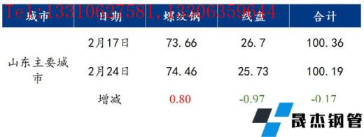 本周山東13個主要城市建筑厚壁無縫鋼管總庫存100.19萬噸,較上周降低0.17萬噸,較去年同期降低48.04萬噸。其中,螺紋鋼74.46萬噸,較上周增加0.8萬噸,盤螺25.73萬噸,較上周降低0.97萬噸。