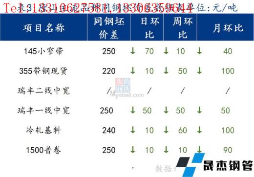 145帶鋼與鋼坯價差明顯收窄,調坯軋材在成本偏高的制約下暫緩復產,市場成交不佳,價格繼續回落。焊管與355帶鋼價差稍收窄。熱卷與帶鋼價差回歸正區間。