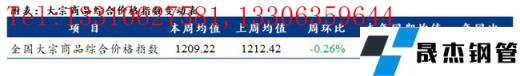 全國大宗商品綜合價格指數(shù)均值為1209.22,環(huán)比下降,降幅0.26%(前值4.39%);同比上升,增幅15.19%(前值17.06%)。