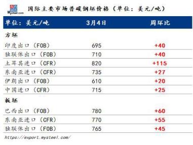 此外,本周印度多家無縫厚壁鋼管廠家再次進(jìn)行方坯出口招標(biāo)。據(jù)了解,印度Vizag公司對3萬噸方坯(150x150mm, 3SP/4SP)出口招標(biāo),目前接到的投標(biāo)價格高達(dá)720美元/噸FOB,印度國內(nèi)方坯價格也隨著成本上漲而上漲,獨聯(lián)體資源供應(yīng)中斷也提振了印度方坯價格。