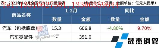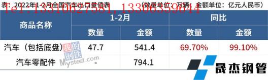 免責聲明:本網站(山東聊城晟杰無縫鋼管廠www.vsocial.cn)刊載的“海關總署:1-2月中國出口汽車47.7萬輛,同比增99.10%”等均源于網絡,版權歸原作者所有,且僅代表原作者觀點,本文所載信息僅供參考。轉載僅為學習與交流之目的,如無意中侵犯您的合法權益,請及時聯系刪除。本網站刊登此篇文章并不意味著本站贊同其觀點或證實其內容的真實性,我們不對其科學性、嚴肅性等作任何形式的保證。如果侵犯了您的版權,請盡快聯系我們予以撤銷,謝謝合作!