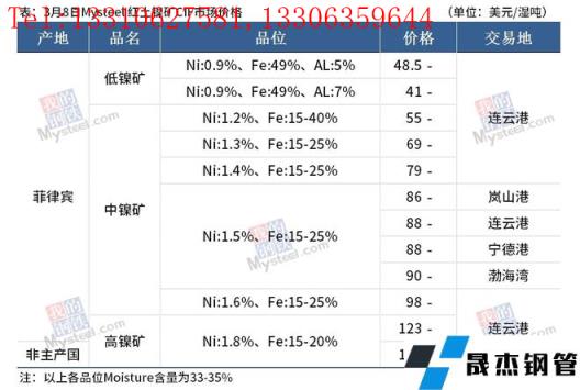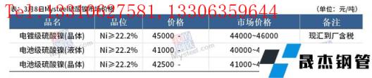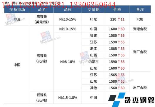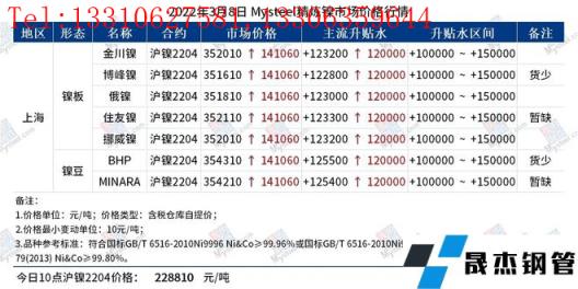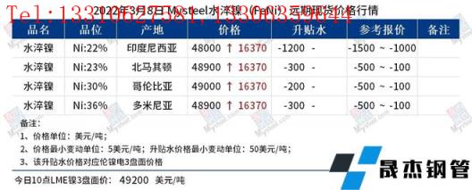 免責聲明:本網(wǎng)站(山東聊城晟杰無縫鋼管廠www.vsocial.cn)刊載的“鎳產(chǎn)業(yè)鏈價格(2022.3.8)”等均源于網(wǎng)絡(luò),版權(quán)歸原作者所有,且僅代表原作者觀點,本文所載信息僅供參考。轉(zhuǎn)載僅為學(xué)習(xí)與交流之目的,如無意中侵犯您的合法權(quán)益,請及時聯(lián)系刪除。本網(wǎng)站刊登此篇文章并不意味著本站贊同其觀點或證實其內(nèi)容的真實性,我們不對其科學(xué)性、嚴肅性等作任何形式的保證。如果侵犯了您的版權(quán),請盡快聯(lián)系我們予以撤銷,謝謝合作!