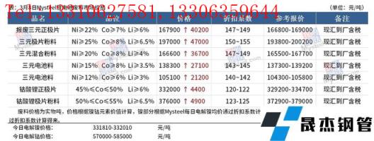 3月8日鋰電池廢料系數(shù)持平,其中三元正極片系數(shù)147-149,三元正極片粉系數(shù)150-155,鈷酸鋰極片系數(shù)120-122,鈷酸鋰極片粉料系數(shù)123-125。
