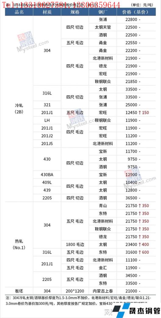 3月8日無錫市場300系價格偏強運行,日內民營冷熱軋價格漲幅1550-1600元/噸,截至下午四點,民營304冷軋主流價格至21900-22000元/噸毛基,民營熱軋資源五尺毛邊主流價格至21650-21950元/噸;200系價格偏強運行,日內冷熱軋有400元/噸左右的上漲,截至下午四點,無錫市場201J2/J5四尺冷軋價格主流成交在11200-11300元/噸毛基,五尺熱軋主流成交在11900-12000元/噸;400系價格穩(wěn)中偏強運行,目前太鋼、酒鋼430冷軋切邊主流價格9750-9900元/噸。