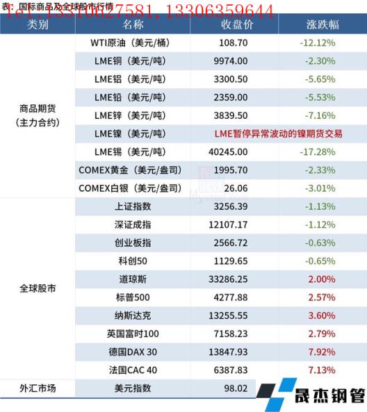 免責聲明:本網站(山東聊城晟杰無縫鋼管廠www.vsocial.cn)刊載的“2022年03月10日早讀:黑色系夜盤全線下挫,國際油價大跌超12%”等均源于網絡,版權歸原作者所有,且僅代表原作者觀點,本文所載信息僅供參考。轉載僅為學習與交流之目的,如無意中侵犯您的合法權益,請及時聯系刪除。本網站刊登此篇文章并不意味著本站贊同其觀點或證實其內容的真實性,我們不對其科學性、嚴肅性等作任何形式的保證。如果侵犯了您的版權,請盡快聯系我們予以撤銷,謝謝合作!