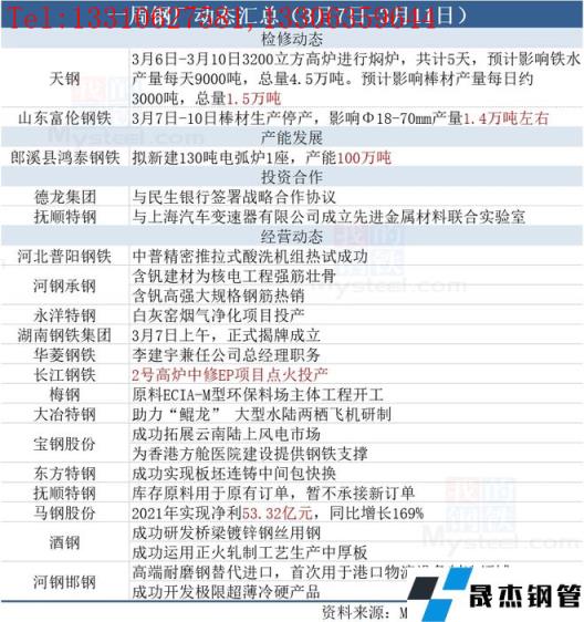據(jù)不完全統(tǒng)計(jì),本周(3月7日-3月11日)有2家無縫厚壁鋼管廠家發(fā)布檢修動態(tài),具體如下: