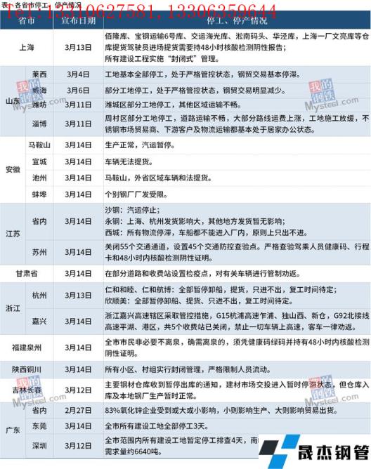 近期,全國(guó)疫情呈現(xiàn)局部高度聚集和多點(diǎn)散發(fā)態(tài)勢(shì),對(duì)國(guó)內(nèi)大宗商品市場(chǎng)的供應(yīng)端、需求端、物流及倉(cāng)儲(chǔ)等方面都有不同程度的影響。據(jù)統(tǒng)計(jì),截至3月15日,全國(guó)多個(gè)省市發(fā)布停工停產(chǎn)情況。其中受疫情影響最大的吉林省于3月12日宣布,長(zhǎng)春市主要厚壁無(wú)縫鋼管倉(cāng)庫(kù)暫停出庫(kù),當(dāng)?shù)亟ú氖袌?chǎng)交投進(jìn)入暫時(shí)停滯狀態(tài),倉(cāng)庫(kù)入庫(kù)及本地?zé)o縫厚壁鋼管廠家生產(chǎn)暫時(shí)正常。深圳市于3月12日宣布,全市范圍內(nèi)所有建設(shè)工地暫定停工排查4天,南山及福田區(qū)域厚壁無(wú)縫鋼管市場(chǎng)預(yù)計(jì)共影響需求量約6640噸。與此同時(shí),全國(guó)其他地區(qū)鋼貿(mào)交易也受到影響,部分工地開(kāi)始停工,物流運(yùn)輸暫停服務(wù)。具體情況如下: