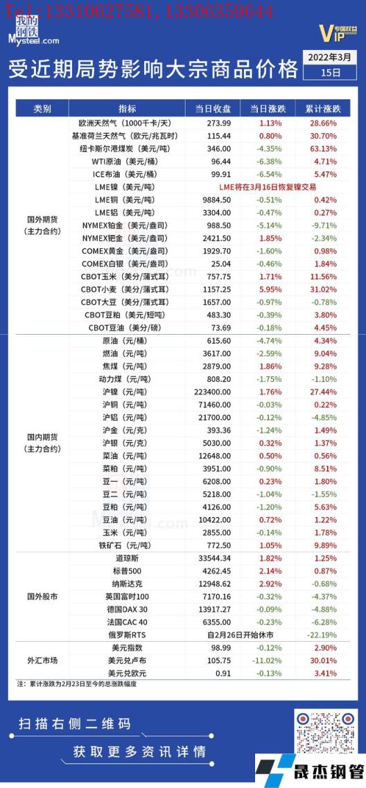 近期,受國際局勢影響,全球金融及大宗商品市場出現(xiàn)較大波動。3月15日,國際能源價格繼續(xù)大跌,WTI原油與布油均降至100美元以下。匯總情況如下: