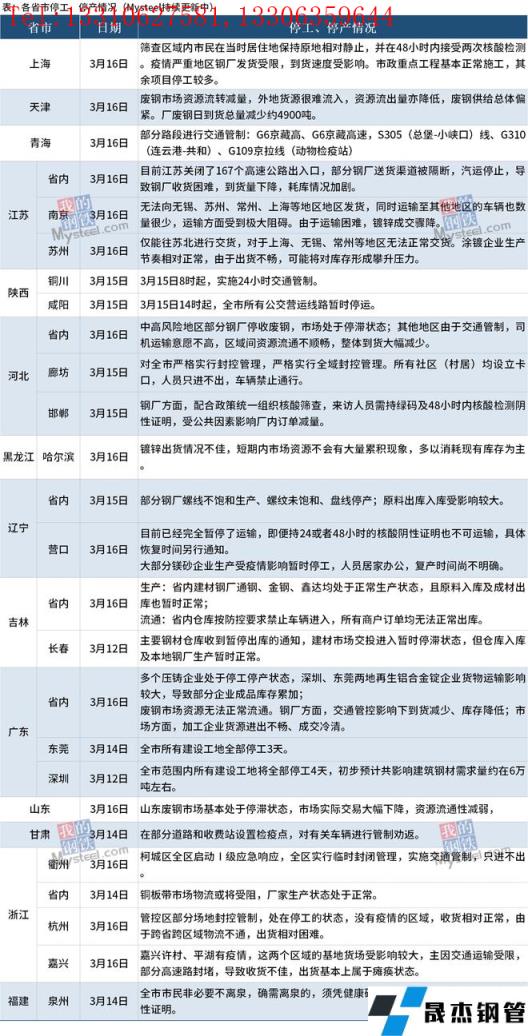 截至3月17日,匯總14個省份停工停產(chǎn)最新信息。其中,上海市疫情嚴(yán)重地區(qū)無縫厚壁鋼管廠家發(fā)貨受限,到貨速度受影響;市政重點工程基本正常施工,其余項目停工較多。河北省內(nèi)中高風(fēng)險地區(qū)部分無縫厚壁鋼管廠家停收廢鋼 ,市場處于停滯狀態(tài);其他地區(qū)由于交通管制,司機運輸意愿不高,區(qū)域間資源流通不順暢,整體到貨大幅減少。廣東省內(nèi)多個壓鑄企業(yè)處于停工停產(chǎn)狀態(tài),深圳、東莞兩地再生鋁合金錠企業(yè)貨物運輸影響較大,導(dǎo)致部分企業(yè)成品庫存累加;吉林省省內(nèi)建材無縫厚壁鋼管廠家通鋼、金鋼、鑫達均處于正常生產(chǎn)狀態(tài),且原料入庫及成材出庫也暫時正常;省內(nèi)倉庫按防控要求禁止車輛進入,所有商戶訂單均無法正常出庫。具體情況如下: