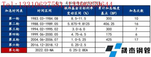 從歷史上來看(表1),美聯儲一共進行了6輪加息周期,雖然美聯儲基于同樣的出發點為了控制通脹風險,維持經濟穩步發展進行調控,但其中造成每次加息的因素多種多樣,最早的時間可以追溯到1983年期間,美國在經濟復蘇的初期中通脹率達到了驚人的13.5%后美聯儲急需控制通脹率;也不乏在1999與2004年中為了對抗互聯網泡沫以及房地產泡沫;在2016年第六輪加息中為了平衡前期充分的量化寬松。北京時間3月17日零點美聯儲第七輪加息正式落地,其中根據圖1美聯儲FOMC點陣圖做出的預判,本年度2022年加息次數將預計達到7次,并且在2023年底利率將達到2.8%。