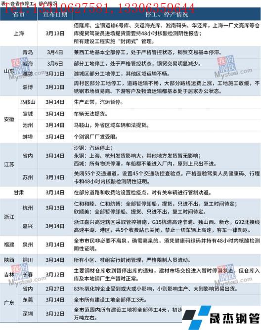 據(jù)統(tǒng)計(jì),截至3月15日,全國多個(gè)省市發(fā)布停工停產(chǎn)情況。其中受疫情影響最大的吉林省于3月12日宣布,長(zhǎng)春市主要厚壁無縫鋼管倉庫暫停出庫,當(dāng)?shù)亟ú氖袌?chǎng)交投進(jìn)入暫時(shí)停滯狀態(tài),倉庫入庫及本地?zé)o縫厚壁鋼管廠家生產(chǎn)暫時(shí)正常。深圳市于3月12日宣布,全市范圍內(nèi)所有建設(shè)工地暫定停工排查4天,南山及福田區(qū)域厚壁無縫鋼管市場(chǎng)預(yù)計(jì)共影響需求量約6640噸,深圳全市范圍初步預(yù)計(jì)共影響建筑厚壁無縫鋼管需求量約6萬噸。與此同時(shí),全國其他地區(qū)鋼貿(mào)交易也受到影響,部分工地開始停工,物流運(yùn)輸暫停服務(wù)。具體情況如下: