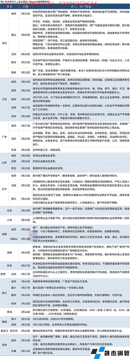 截至3月21日,匯總了16個省份停工停產(chǎn)最新信息。其中,3月21日,南京全市范圍內(nèi)除保障市民生活和城市基本運行的水、電、燃油、燃?xì)狻⑼ㄓ崱h(huán)衛(wèi)、糧油肉菜供應(yīng)等公共服務(wù)類企事業(yè)單位外,其他有條件的單位盡可能安排居家辦公。3 月20日,唐山開平區(qū)、豐南區(qū)、灤州市、遷西縣全域?qū)嵤﹪?yán)格封控管理;大部分鋼企維持生產(chǎn),但政府實施道路管控,無縫厚壁鋼管廠家均面臨運輸方面的問題。深圳全市福田、羅湖、南山、寶安、龍崗以及龍華暫未恢復(fù),全市封控區(qū)、管控區(qū)、防范區(qū)繼續(xù)嚴(yán)格執(zhí)行疫情防控相關(guān)措施。山東濰坊日照、青島萊西市實現(xiàn)社會面動態(tài)清零。河北滄州連續(xù)4天實現(xiàn)社會面動態(tài)清零,3月20日起部分地區(qū)逐步解除封控。具體情況如下: