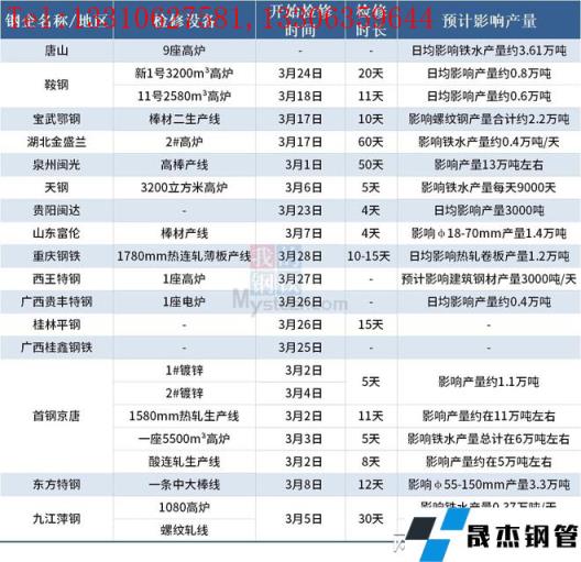 據(jù)不完全統(tǒng)計,截至3月28日超20家無縫厚壁鋼管廠家發(fā)布檢修計劃。其中,檢修時間最長的是湖北金盛蘭,計劃自3月17日對2#高爐進行檢修兩個月,預計影響鐵水產(chǎn)量約0.4萬噸/天,復產(chǎn)時間5月16日。