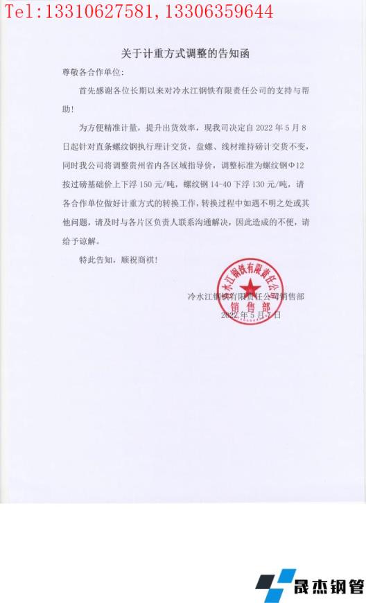 免責聲明:本網站(山東聊城晟杰無縫鋼管廠www.vsocial.cn)刊載的“冷水江鋼鐵有限責任公司關于對貴州區(qū)域計重方式調整的告知函”等均源于網絡,版權歸原作者所有,且僅代表原作者觀點,本文所載信息僅供參考。轉載僅為學習與交流之目的,如無意中侵犯您的合法權益,請及時聯系刪除。本網站刊登此篇文章并不意味著本站贊同其觀點或證實其內容的真實性,我們不對其科學性、嚴肅性等作任何形式的保證。如果侵犯了您的版權,請盡快聯系我們予以撤銷,謝謝合作!