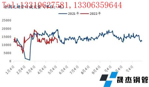 從4月份的成交數據來看,4月份國內無縫管日均成交量在1.25萬噸,去年4月份整體日均成交在1.65萬噸,4月份成交量相較去年同期明顯減少,而進入5月份無縫管需求量整體偏低,日前無縫管日成交量處于1.1萬噸的水平,在預期中,市場原本可能被釋放的需求還是未得到釋放,供需兩弱格局延續,短期來看5月強預期“不強”。由于目前市場還是處于供需雙緊的情況,所以無縫管的價格還能保持相對堅挺。