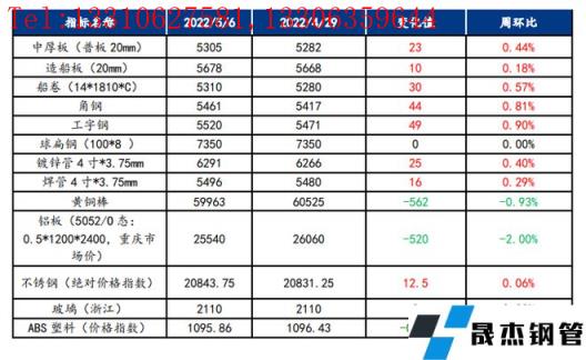 截止2022年5月6日,各原材料當日即時價格以及價格周環(huán)比情況如下: