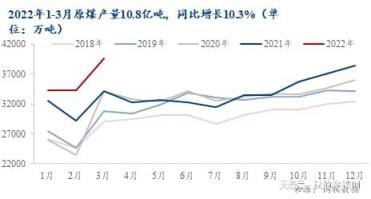 2022年1-3月全國原煤產量累計生產10.8億噸,同比增長10.3%,其中3月份原煤產量3.96億噸,同比增長14.8%。國家能源局3月發布《2022年能源工作指導意見》,提出將著力增強國內能源生產保障能力,切實把能源飯碗牢牢地端在自己手里。