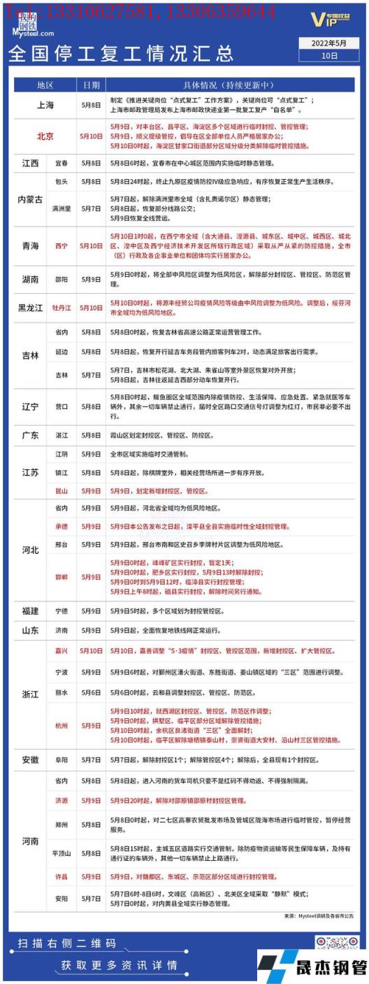 免責聲明:本網站(山東聊城晟杰無縫鋼管廠www.vsocial.cn)刊載的“疫情影響丨全國停工復工情況匯總(5月10日)”等均源于網絡,版權歸原作者所有,且僅代表原作者觀點,本文所載信息僅供參考。轉載僅為學習與交流之目的,如無意中侵犯您的合法權益,請及時聯系刪除。本網站刊登此篇文章并不意味著本站贊同其觀點或證實其內容的真實性,我們不對其科學性、嚴肅性等作任何形式的保證。如果侵犯了您的版權,請盡快聯系我們予以撤銷,謝謝合作!