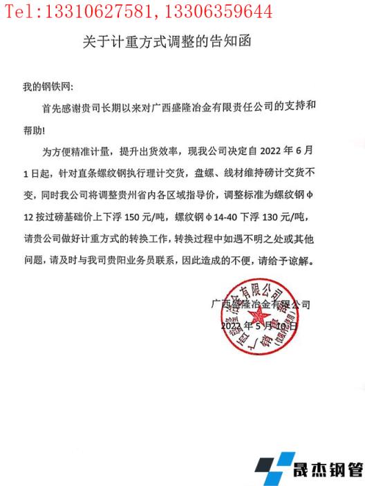 免責聲明:本網站(山東聊城晟杰無縫鋼管廠www.vsocial.cn)刊載的“廣西盛隆冶金有限公司關于對貴州區域計重方式調整的告知函”等均源于網絡,版權歸原作者所有,且僅代表原作者觀點,本文所載信息僅供參考。轉載僅為學習與交流之目的,如無意中侵犯您的合法權益,請及時聯系刪除。本網站刊登此篇文章并不意味著本站贊同其觀點或證實其內容的真實性,我們不對其科學性、嚴肅性等作任何形式的保證。如果侵犯了您的版權,請盡快聯系我們予以撤銷,謝謝合作!